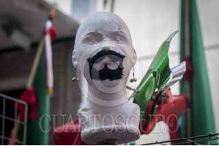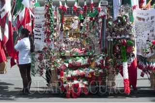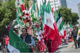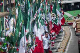 MÉXICO, D.F., 01SEPTIEMBRE2014.- Comerciantes de productos alusivos a las fiestas patrias organizaron una marcha del Monumento a la Revolución rumbo a calles del centro histórico para dar el banderazo al inicio de sus ventas y repartirse los puntos en los que se encontrará cada puesto ambulante. Entre la mercancía que ofrecen se encuentran banderas de muchos tamaños, escudos, bigotes, bisutería, ropa, muñecos y todo lo que tenga que ver con el fervor patrio. FOTO: DIEGO SIMÓN SÁNCHEZ /CUARTOSCURO.COM