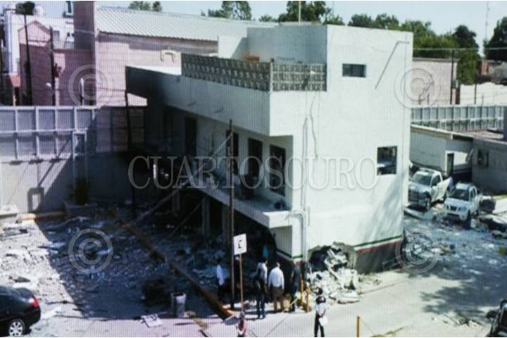 MÉXICO, D.F., 01SEPTIEMBRE2014.- Imagen tomada en la pantalla colocada en la sala de prensa de la PGR donde se ratificó que la explosión en las oficinas del SAT en Piedras Negras, Coahuila, fue por una fuga de gas en una línea subterránea. FOTO: CUARTOSCURO.COM