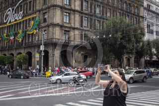 MEXICO, D.F., 06SEPTIEMBRE2014.- Una mujer se detiene a media calle para tomar una foto de los adornos alusivos al aniversario de la Independencia, instalados en los edificios aledaños al zócalo capitalino. FOTO: DAVID POLO /CUARTOSCURO.COM