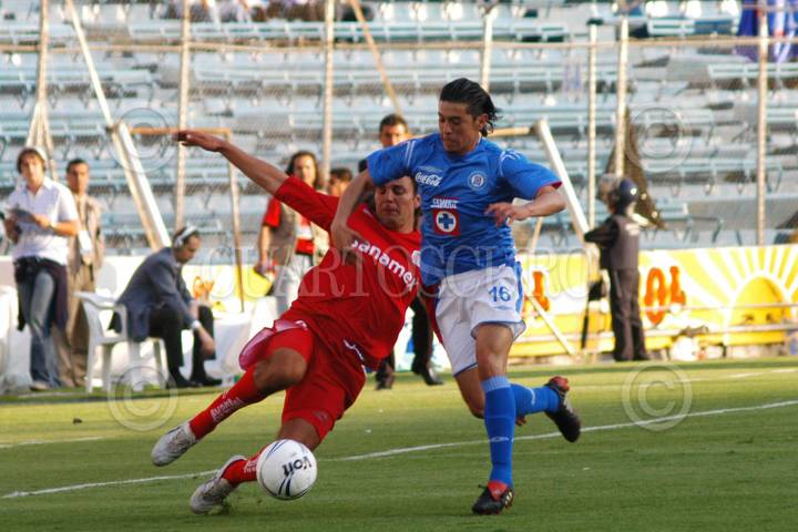 MEXICO, D.F. 04FEBRERO2006.- Manuel de la Torre (Toluca) y Rogelio Chávez (Cruz Azul) disputan un balón durante el partido de la cuarta jornada del torneo de clausura 2006 donde la máquina celeste se impuso 2 a 1. FOTO:Miriam Sánchez/CUARTOSCURO.COM