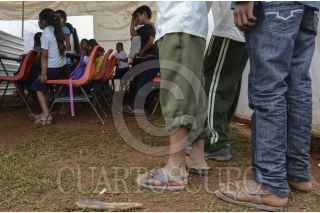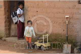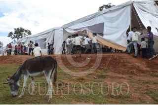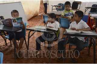 CHILAPA, GUERRERO, 12SPETIEMBRE2014.- Los días 14,15 y 16 de septiembre de 2013 las torrenciales lluvias de Manuel e Ingrid causaron deslaves de cerros y laudes de tierra en la comunidad San Marcos Majada de Toro, en la sierra de Chilapa, lo que dejó incomunicados a más de mil 600 ciudadanos. A un año de las tormentas más de 450 familias no han sido reubicadas y el apoyo por parte de los tres niveles de gobierno es nulo. Sólo los integrantes del Cártel de los Ardillos han apoyado con comida, cobertores y agua a los pobladores, quienes temen ahora por la nueva temporada de huracanes, pues ni siquiera han podido recuperarse de la anterior. En la imagen, niños de la primaria bilingüe Tezcatlipoca, quienes deben tomar clases entre el lodo y las lluvias, pues la escuela se derrumbó en los deslaves. FOTO: BERNANDINO HERNÁNDEZ /CUARTOSCURO.COM