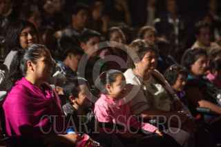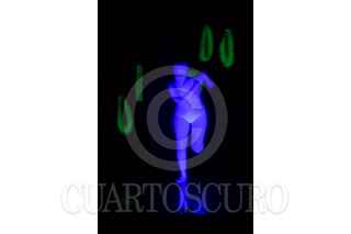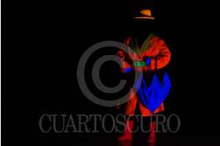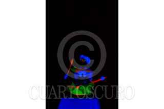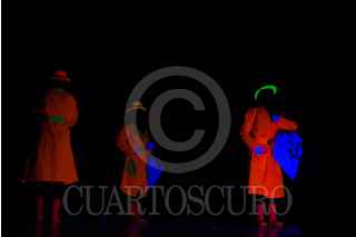MEXICO, D.F., 13SEPTIEMBRE2014.- Entre luces de neón, colores chillantes y una oscuridad en el recinto, la compañía de teatro infantil Frederik se presentó en el Faro Milpa Alta, al sur de la ciudad, en el marco del 4° Festival de circo, pantomima y clown, organizado por esta institución que se dedica a la difusión de la cultura y el arte. En la imagen, aspectos de un acto con luz negra que recuerda la obra del pintor René Magritte. FOTO: DAVID POLO /CUARTOSCURO.COM