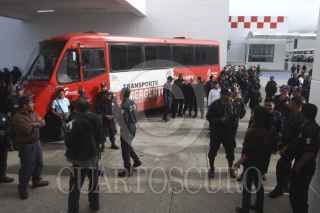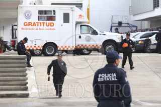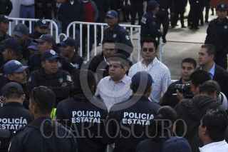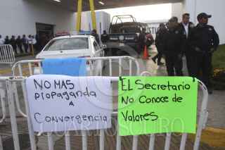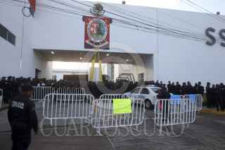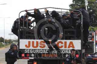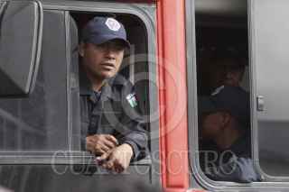 SANTA MARÍA COYOTEPEC, OAXACA, 14SEPTIEMBRE2014.- Elementos de la policía estatal iniciaron este domingo un paro de labores para exigir al titular de esta dependencia, Alberto Esteva Salinas renuncia al cargo acusándolo de utilizar los recursos públicos para iniciar campaña hacia la gubernatura, además exigieron el cese de diversos mandos de esa corporación. De acuerdo con los elementos más del 80 por ciento de los 2 mil 500 uniformados que hay en el estado se unieron al paro de labores y la toma del cuartel ubicado en Santa María Coyotepec. FOTO: ARTURO PÉREZ ALFONSO /CUARTOSCURO.COM