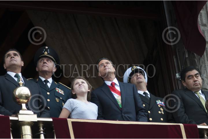 MÉXICO, D.F.,16SEPTIEMBRE2014.- Silvano Aureoles Conejo, presidente de la Cámara de Diputados; Enrique Peña Nieto, presidente de México; Angélica Rivera de Peña; Francisco Vidal Soberón, Secretario de Marina Armada de México; y Luis Barbosa Huerta, presidente del Senado de la República; durante el desfile cívico militar conmemorativo a la independencia de México. FOTO: IVÁN STEPHENS /CUARTOSCURO.COM