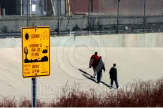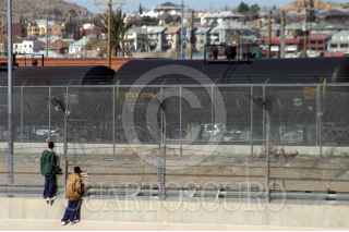 CIUDAD JUAREZ, CHIHUAHUA11febrero2006,- Detras de la malla fronteriza, se ve a un par de inmigrantes esperar el momento opurtuno para tratar de ingresar de manera ilegal a territorio de los EU. La imagen en la zona de los ferrocarriles de carga, en los cuales suelen introducirse los inmigrantes para llegar al interior de los EU. FOTO: JGuadalupe Perez/CUARTOSCURO.COM