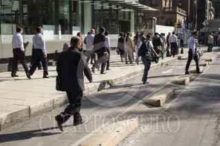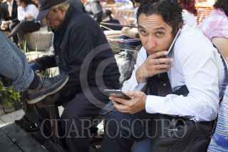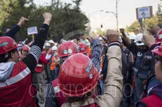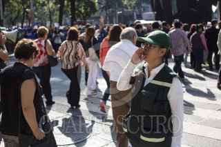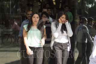 MEXICO, D.F., 19SEPTIEMBRE2014.- El día de hoy se conmemoran 29 años del terremoto que sacudió la Ciudad de México la mañana del 19 de septiembre de 1985, dejando un saldo de 10 mil heridos y 150 mil damnificados, entre muchas otras pérdidas materiales y económicas. Para recordarlo y prevenirlo se llevan a cabo simulacros en escuelas y edificios que sirven además, para estar preparados ante un posible nuevo evento sísmico. En la imagen, trabajadores de la Torre Banamex gritan, con u puño al aire, el lema de la contrucción antes de volver a sus labores, interrumpidas por el simulacro. FOTO: DAVID POLO/ CUARTOSCURO.COM