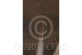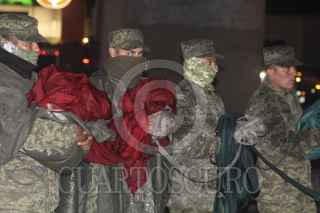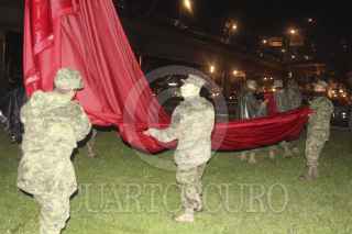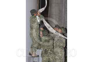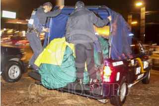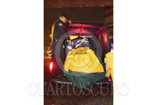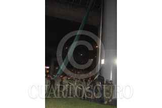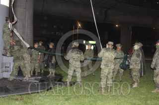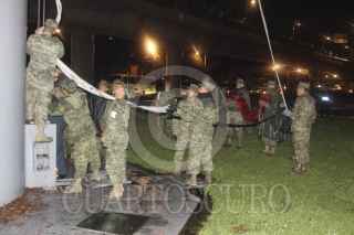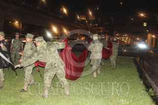 MÉXICO, D.F., 22SEPTIEMBRE2014.- Debido a la lluvia y al fuerte viento que se registró en el sur-poniente de la ciudad se desgarro y cayo la bandera monumental de San Jerónimo en la glorieta de Periferico y San Jerónimo. Personal de la SEDENA acudió al lugar para quitar el tramo que quedo en el asta. Personal del sector San Jerónimo de la SSP-DF taparon la bandera que cayo con impermeables para que no fuera fotografiada por los medios de comunicación. FOTO: SAÚL LÓPEZ //CUARTOSCURO.COM