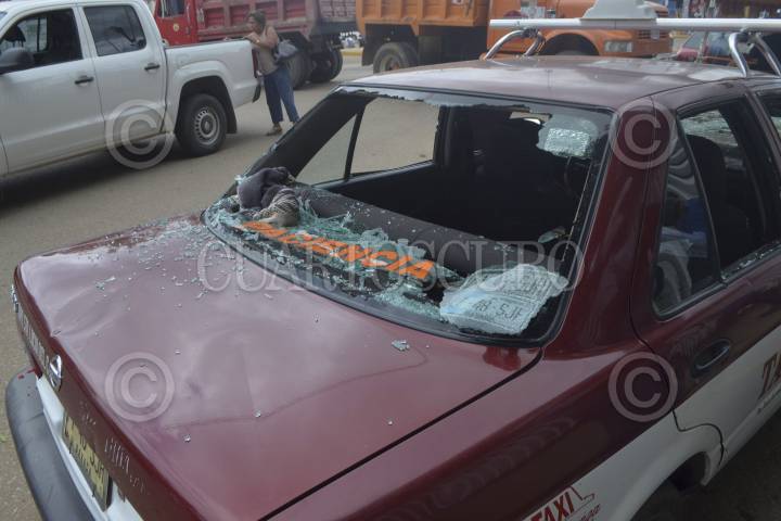 OAXACA, OAXACA, 25SEPTIEMBRE2014.- Integrantes de la Confederación Nacional de la Productividad (CNP) tomaron las instalaciones del recién inaugurado centro comercial Macroplaza en Santa Lucía del Camino, los transportistas piden instalar un sitio de taxis en esa zona, durante el bloqueo fue dañado un taxi con placas 7148SJH. FOTO: ARTURO PÉREZ ALFONSO /CUARTOSCURO.COM