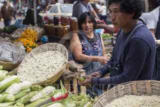 MEXICO, D.F, 27SEPTIEMBRE2014.- Dentro y fuera del mercado de Xochimilco se oyen durante todo el día los pregones de los vendedores que anuncian productos tan diversos que es posible comprar desde un cortauñas hasta una gallina o guajolote. La variedad de productos del campo abarca desde hongos, champiñones y vegetales hasta cualquier tipo de flores y plantas. En la imagen, vendedores de maíz y elotes afirman que el precio de estos productos no ha variado en el precio de venta al público, pese a la crisis en el campo debido a la sobreproducción que devaluó el valor del frijol y maíz. FOTO: DAVID POLO /CUARTOSCURO.COM