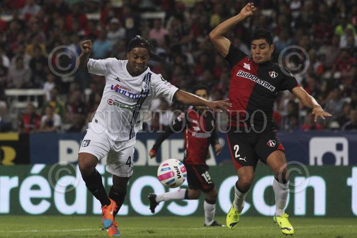 GUADALAJARA, JALISCO, 30SEPTIEMBRE2014.- Esta noche en el Estadio Jalisco de y en partido correspondiente a la Jornada 11 del Torneo Apertura 2014 de la Liga MX, se enfrentan los equipos de los Zorros del Atlas frente a Gallos Blancos de Querétaro. En la imagen el jugador del Querétaro Ronaldo de Assis disputa un balón frente al contrario del Atlas, Enrique Pérez. FOTO: FERNANDO CARRANZA GARCIA /CUARTOSCURO.COM