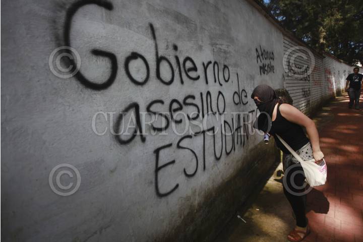 XALAPA, VERACRUZ, 02OCTUBRE2014.- Cientos de estudiantes y maestros marcharon por las principales calles de Xalapa en conmemoración de la matanza de Tlatelolco. Durante el recorrido causaron destrozos y pintas en instalaciones de partidos políticos, policiales, bancarias y deportivas. Los manifestantes exigieron la presentación con vida de los normalistas de Ayotzinapa desaparecidos en Iguala. FOTO: FÉLIX MÁRQUEZ /CUARTOSCURO.COM