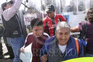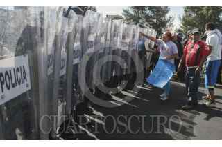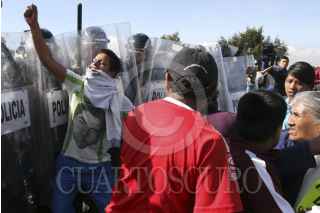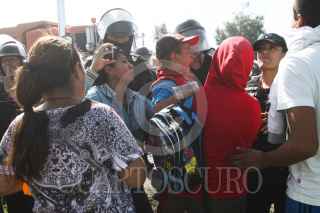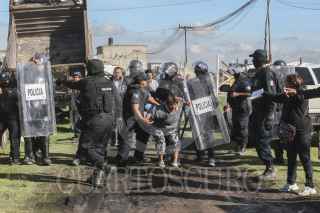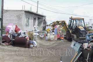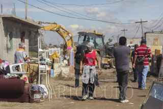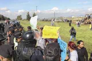 TEXCOCO, ESTADO DE MÉXICO, 03OCTUBRE2014.- Policías antimotines de Texcoco y de la Secretaria de Seguridad Ciudadana, desalojaron a familias y derribaron sus viviendas con maquinaria pesada. Los desalojados bloquearon la autopista Peñon-Texcoco para exigir la presencia de la presidenta municipal y argumentaron que no son invasores debido a que sus predios fueron comprados con ejidatarios de San Miguel Tocuila. Dicho predio donde se realizo el desalojo se ubica a escasos dos kilómetros donde se pretende construir en nuevo aeropuerto internacional de la Ciudad de México. FOTO: SAÚL LÓPEZ /CUARTOSCURO.COM