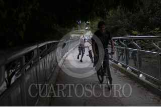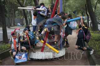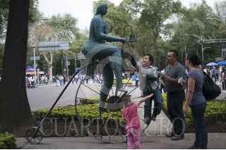 MÉXICO, D.F., 05OCTUBRE2014.- Una familia juega en la escultura "Señora Ciclista" de Joy Laville de la exhibición "campanas" en el camellón de Paseo de la Reforma. FOTO: IVÁN STEPHENS / CUARTOSCURO.COM