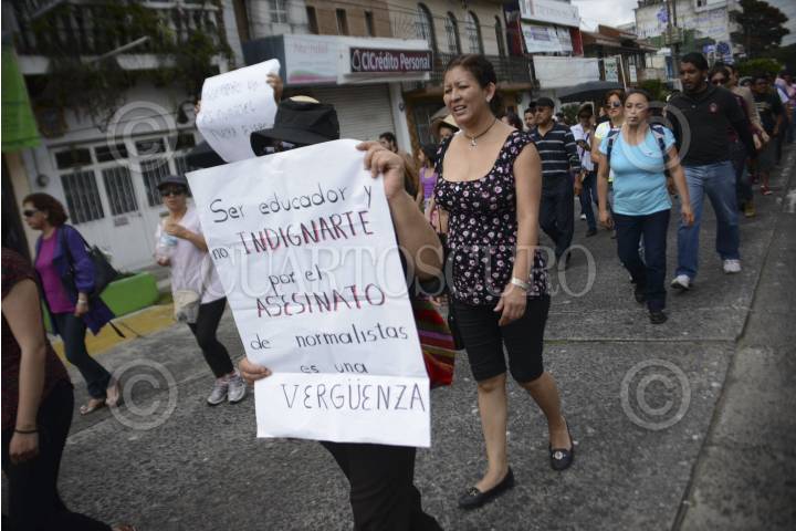 XALAPA, VERACRUZ, 05OCTUBRE14.- Integrantes del Movimiento Magisterial Popular Veracruzano adherido a la CNTE, marcharon de la Benemérita Escuela Normal Veracruzana hacia la plaza Lerdo en apoyo a los estudiantes asesinados de la Escuela Normal Rural de Ayotzinapa en el municipio de Tixtla, Guerrero. FOTO: RUBÉN ESPINOSA /CUARTOSCURO.COM