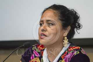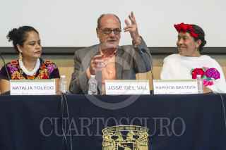 MÉXICO, D.F., 06OCTUBRE2014.- Las poetas Natalia Toledo y Ruperta Bautista, así como José del Val, director de México Nación Multicultural de la UNAM, durante la conferencia de prensa donde presentaron el VI Festival de Poesía "Las Lenguas de América, Carlos Montemayor", que se realizará este jueves en la Sala Nezahualcóyotl. FOTO: ISAAC ESQUIVEL /CUARTOSCURO.COM