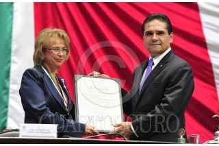 MÉXICO, D.F., 09OCTUBRE2014.- El presidente de la Mesa Directiva, el perredista Silvano Aureoles entregó a la ministra Olga Sánchez Cordero la Medalla al Mérito Cívico Eduardo Neri y Legisladores de 1913, quien fue nominada por el rector de la Universidad Nacional Autónoma de México, José Narro. FOTO: SAÚL LÓPEZ /CUARTOSCURO.COM