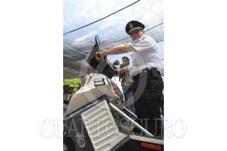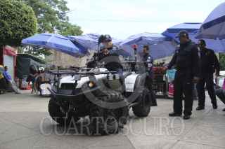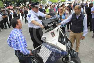 CUERNAVACA, MORELOS, 10OCTUBRE2014.- Alberto Capella, secretario de Seguridad Pública y Jaime Álvarez Cisneros, secretario de Turismo echan un vistazo al nuevo equipo, previo a la presentación de la flotilla de patrullas viales en la Plaza de Armas. FOTO: PATRICIA MORALES /CUARTOSCURO.COM