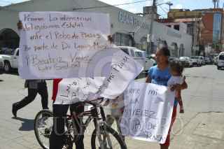 IGUALA, GUERRERO, 11OCTUBRE2014.- Una pareja acompañado de sus pequeñas hijas protestaron antes de la llegada del gobernador Ángel Aguirre Rivero, para que intervenga y le devuelvan su plaza de trabajo que supuestamente les fue robada por el secretario de salud Lázaro Mason y Beatriz Vélez, líder sindical de trabajadores de salud, según lo afirmaban en sus pancartas. FOTO: JOSÉ I. HERNÁNDEZ /CUARTOSCURO.COM