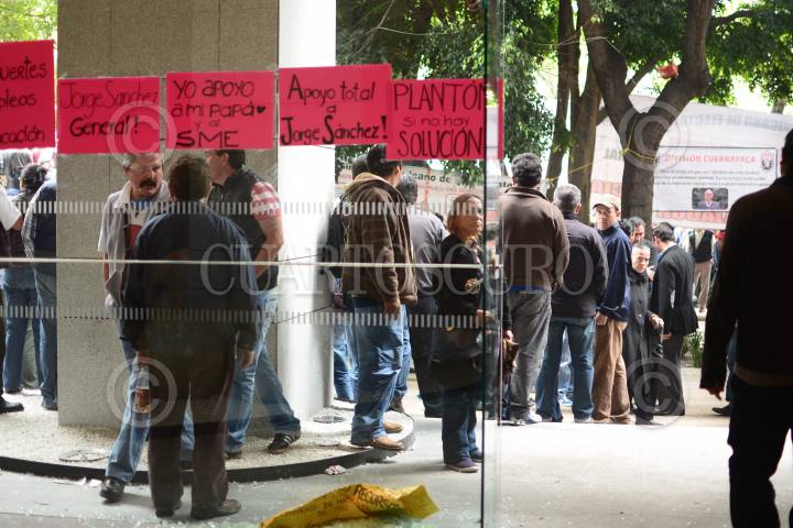 MÉXICO, D.F., 14OCTUBRE2014.- Integrantes del Sindicato Mexicano de Electricistas, rompieron las puertas de cristal del edificio de la Secretaria del Trabajo en Reforma donde realizaron también un mitin para conmemorar el 5to aniversario de la desaparición de Luz y Fuerza del Centro. FOTO: ISABEL MATEOS /CUARTOSCURO.COM