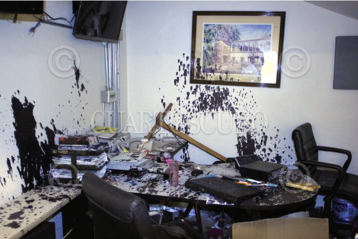 MÉXICO, D.F., 14OCTUBRE2014.- Trabajadores y elementos de seguridad, limpian los escombros que dejaron Integrantes del Sindicato Mexicano de Electricistas cuando rompieron las puertas de cristal y la planta baja del edificio de la Secretaria del Trabajo en Reforma donde realizaron también un mitin para conmemorar el 5to aniversario de la desaparición de Luz y Fuerza del Centro. FOTO: ENRIQUE ORDÓÑEZ /CUARTOSCURO.COM