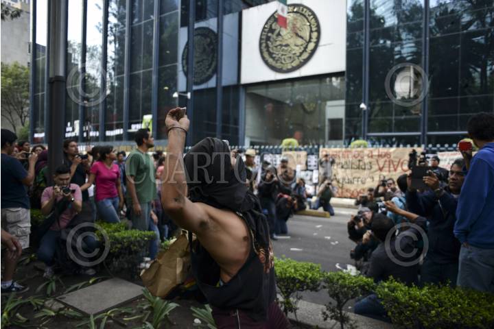 MÉXICO, D.F., 15OCTUBRE2014.- Estudiantes de la Universidad Nacional Autónoma de México, Universidad Autónoma de México y Universidad Autónoma de la Ciudad de México, entre otras, además de organizaciones sociales y políticas, se manifestaron frente al edificio de la Procuraduría General de la República (PGR) en demanda de la aparición con vida de los 43 estudiantes normalistas desaparecidos el 26 de septiembre en Iguala, Guerrero. Con mantas, consignas, pintas, representaciones escénicas y rabia, miles, en su mayoría jóvenes, exigieron el esclarecimiento del los 43 estudiantes de Ayotzinapa. Al terminó del mitin programado, algunos jóvenes arrojaron piedras al edificio público, del cual nunca salió ninguna autoridad federal. FOTO: ADOLFO VLADIMIR /CUARTOSCURO.COM