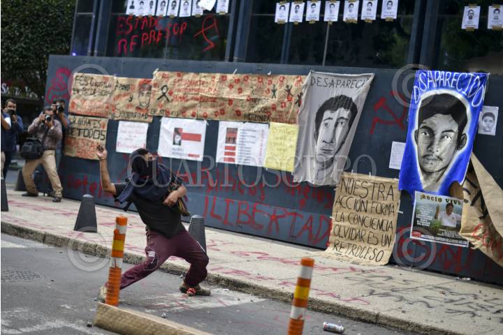 MÉXICO, D.F., 15OCTUBRE2014.- Estudiantes de la Universidad Nacional Autónoma de México, Universidad Autónoma de México y Universidad Autónoma de la Ciudad de México, entre otras, además de organizaciones sociales y políticas, se manifestaron frente al edificio de la Procuraduría General de la República (PGR) en demanda de la aparición con vida de los 43 estudiantes normalistas desaparecidos el 26 de septiembre en Iguala, Guerrero. Con mantas, consignas, pintas, representaciones escénicas y rabia, miles, en su mayoría jóvenes, exigieron el esclarecimiento del los 43 estudiantes de Ayotzinapa. Al terminó del mitin programado, algunos jóvenes arrojaron piedras al edificio público, del cual nunca salió ninguna autoridad federal. FOTO: ADOLFO VLADIMIR /CUARTOSCURO.COM