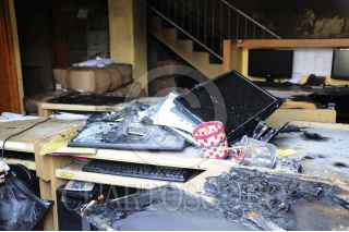 CHILPANCINGO, GUERRERO,20OCTUBRE2014.-Incendian las oficinas de Guerrero Cumple, ubicadas en el centro de la ciudad, presuntamente los hechos fuero en la madrugada, solo una pinta dejaron “Fuera Aguirre” aparentemente dijeron que fuero “Los normalistas o los maestros que mantienen el plantón en el zócalo” pero más tarde en breve entrevistas que dijeron los estudiantes de la normal de Ayotzinapa que “No fuimos nosotros, nuestra primera actividad es aquí en la caseta”. FOTO: JOSÉ I. HERNÁNDEZ /CUARTOSCURO