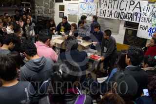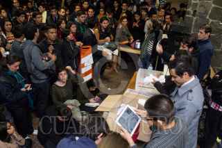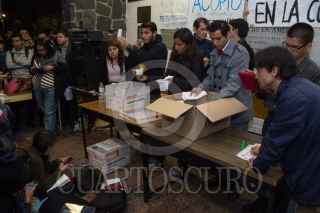 MEXICO, D.F., 21OCTUBRE2014.- Estudiantes de la Facultad de Derecho de la UNAM convocaron una asamblea esta noche para decidir en votación si se adherían o no al paro estudiantil convocado en apoyo a los 43 normalistas desaparecidos en Iguala, Guerrero, el pasado 26 de septiembre. En los resultados preliminires la votación contaba con 2273 votos a favor del paro hacia las 9:30 de la noche. En la imagen, los estudiantes durante el conteo de los votos. FOTO: DAVID POLO /CUARTOSCURO.COM