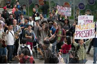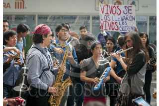 MÉXICO, D.F., 22OCTUBRE2014.- Estudiantes de la Escuela Superior de Música se concentraron en el metro Chabacano para manifestar su apoyo a los normalistas de Ayotzinapa, exigiendo la aparición con vida de los 43 normalistas desaparecidos desde el pasado 26 de septiembre y justicia contra quienes están detrás del secuestro. Durante el mitin los estudiantes cantaron y tocaron sus instrumentos para invitar a las personas que transitaban por el lugar se unieran a las protestas por dicho caso. FOTO: DIEGO SIMÓN SÁNCHEZ /CUARTOSCURO.COM
