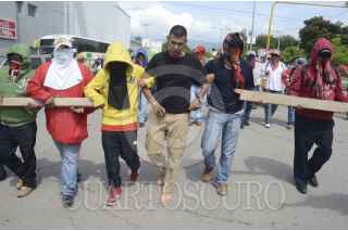 IGUALA, GUERRERO, 22OCTUBRE2014.- Dos presuntos agentes de la Secretaría de Gobernación fueron detenidos en por Profesores integrantes de la Coordinadora Estatal de Trabajadores de la Educación de Guerrero CETEG, UPOEG y estudiantes de la normal rural de Ayotzinapa , así como normalistas de todo el estado, quienes marcharon para exigir la presentación con vida de los 43 estudiantes desaparecidos de Ayotzinapa. Los detenidos marcharon junto con los normalistas descalzos. FOTO: BERNANDINO HERNÁNDEZ /CUARTOSCURO.COM