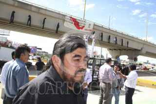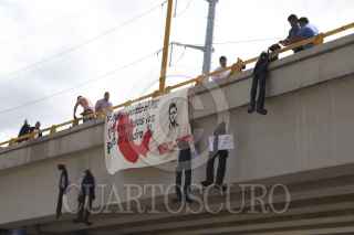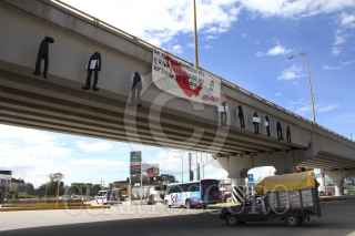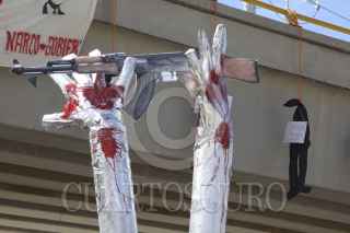 OAXACA, OAXACA, 23OCTUBRE2014.- Integrantes de Comuna Oaxaca se integraron este jueves al paro de 48 horas convocado a nivel nacional para exigir la presentación con vida de los 43 normalistas desaparecidos en Iguala, Guerreo. Flavio Sosa ex líder de la APPO y quien forma parte de la dirigencia colectiva de Comuna, señaló que se instaló el "Monumento al estado fallido", para ello colgaron 9 muñecos del puente de 5 Señoresn en referencia a la narco-política que existe en México. FOTO: ARTURO PÉREZ ALFONSO /CUARTOSCURO.COM