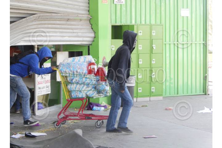 CHILPANCINGO, GUERRERO,25OCTUBRE2014.- Esta mañana estudiantes de la normal rural de Ayotzinapa, como parte del movimiento, que llevan a cabo para exigir al gobierno la aparición con vida de los 43 estudiantes desaparecidos en Iguala, también acudieron a la tienda de autoservicio Aurrera, extrajeron mercancía, de igual manera acudieron a comercial mexicana y escribieron una leyenda todo gratis, las demás tienda departamentales fueron resguardadas por policías estatales con equipo antimotines. FOTO: JOSÉ I. HERNÁNDEZ /CUARTOSCURO.COM