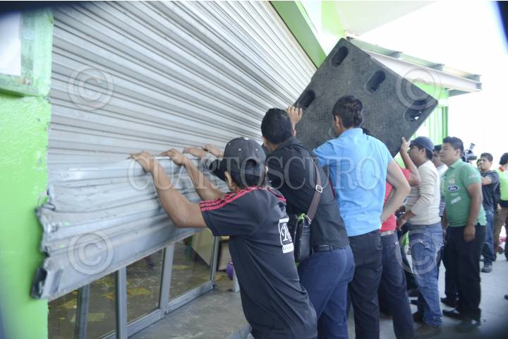 CHILPANCINGO, GUERRERO,25OCTUBRE2014.- Esta mañana estudiantes de la normal rural de Ayotzinapa, como parte del movimiento, que llevan a cabo para exigir al gobierno la aparición con vida de los 43 estudiantes desaparecidos en Iguala, también acudieron a la tienda de autoservicio Aurrera, extrajeron mercancía, de igual manera acudieron a comercial mexicana y escribieron una leyenda todo gratis, las demás tienda departamentales fueron resguardadas por policías estatales con equipo antimotines. FOTO: JOSÉ I. HERNÁNDEZ /CUARTOSCURO.COM