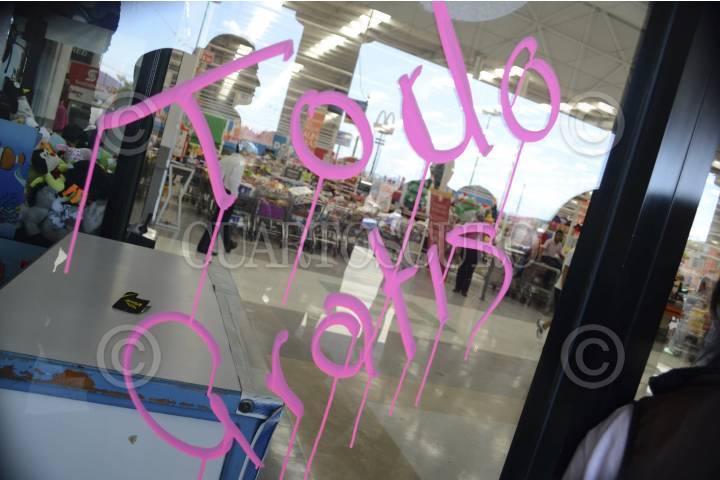 CHILPANCINGO, GUERRERO,25OCTUBRE2014.- Esta mañana estudiantes de la normal rural de Ayotzinapa, como parte del movimiento, que llevan a cabo para exigir al gobierno la aparición con vida de los 43 estudiantes desaparecidos en Iguala, también acudieron a la tienda de autoservicio Aurrera, extrajeron mercancía, de igual manera acudieron a comercial mexicana y escribieron una leyenda todo gratis, las demás tienda departamentales fueron resguardadas por policías estatales con equipo antimotines. FOTO: JOSÉ I. HERNÁNDEZ /CUARTOSCURO.COM