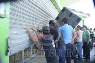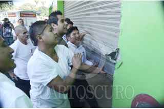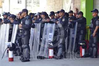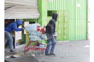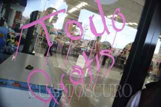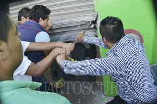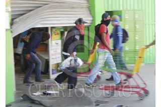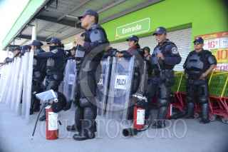 CHILPANCINGO, GUERRERO,25OCTUBRE2014.- Esta mañana estudiantes de la normal rural de Ayotzinapa, como parte del movimiento, que llevan a cabo para exigir al gobierno la aparición con vida de los 43 estudiantes desaparecidos en Iguala, también acudieron a la tienda de autoservicio Aurrera, extrajeron mercancía, de igual manera acudieron a comercial mexicana y escribieron una leyenda todo gratis, las demás tienda departamentales fueron resguardadas por policías estatales con equipo antimotines. FOTO: JOSÉ I. HERNÁNDEZ /CUARTOSCURO.COM