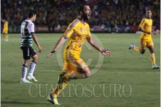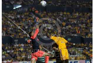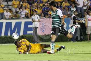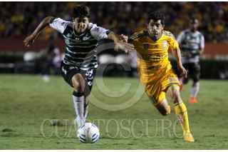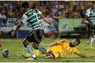 SAN NICOLAS DE LOS GARZA, NUEVO LEON, 29OCTUBRE2014.- Damian Alvarez del equipo de los Tigres de la UANL se disputa el balón contra Oswaldo Alanis del equipo de los Santos Laguna en el estadio Universitario, en la Semifinal de la Copa MX FOTO: GABRIELA PEREZ MONTIEL / CUARTOSCURO.COM