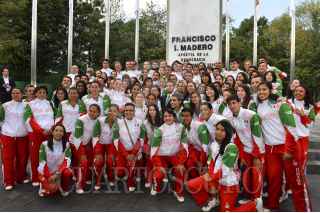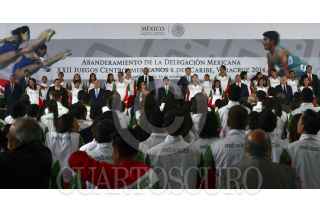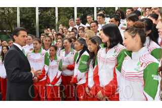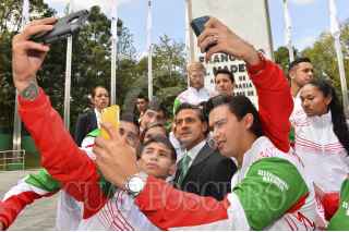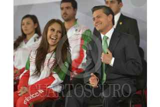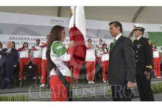 MÉXICO, D.F., 31OCTUBRE2014.- El Presidente de la República, Enrique Peña Nieto, al encabezar el Abanderamiento de Delegación Mexicana que participará en los 22 Juegos Centroamericanos y del Caribe, Veracruz 2014, convocó a los deportistas a portar con orgullo y con dignidad los colores patrios. “Compitan con inteligencia, pero lo más importante, con pasión y con todo el corazón. Tengan siempre presente que cada victoria que obtengan será un triunfo para ustedes, un gran orgullo para sus familias y para todo México”. Indicó. La raquetbolista Paola Longoria fue la encargada de recibir la bandera nacional. FOTO: PRESIDENCIA /CUARTOSCURO.COM
