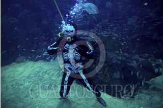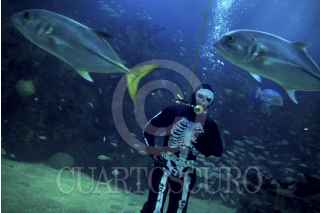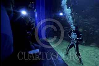 VERACRUZ, VERACRUZ, 31OCTUBRE2014.- Un buzo caracterizado de calavera realiza diversas inmersiones en la gran pecera oceánica del Acuario de Veracruz. La dinámica se realiza para conmemorar el Día de Muertos y busca rescatar las tradiciones de México. La imagen de la calavera se está convirtiendo en la imagen mexicana por excelencia sobre la muerte, es cada vez más común verla plasmada en pinturas y artesanías y objetos elaborados en nuestro país. FOTO: FÉLIX MÁRQUEZ /CUARTOSCURO.COM