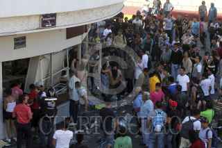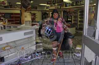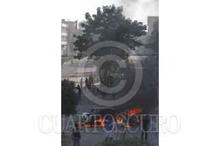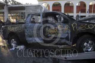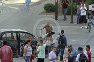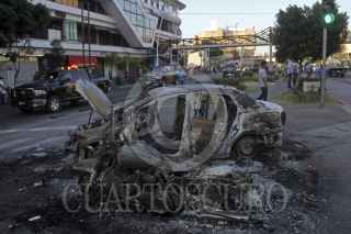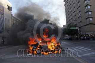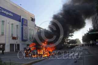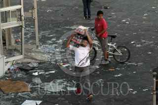 GUADALAJARA, JALISCO, 31OCTUBRE2014.- Cuando se llevaba a cabo un operativo antipiratería en la zona de San Juan de Dios en el centro de la ciudad, comerciantes ambulante salieron de control e incendiaron dos vehículos propiedad del estado así como otro vehículo de un medio de comunicación, también saquearon una tienda de autoservicio, hecho que hasta indigentes y peatones que caminaban por la zona aprovecharon. FOTO: FERNANDO CARRANZA GARCIA /CUARTOSCURO.COM