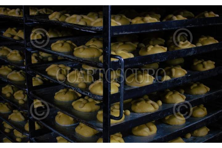 MÉXICO, D.F., 01NOVIEMBRE2014.- La panadería La Vasconia, fundada en 1870, es considerada la más antigua de la ciudad. El equipo de panaderos, comandado por el maestro Dionisio quien se dedica al oficio desde hace 30 años, trabaja desde ayer y hasta hoy en la madrugada para sacar los pedidos de pan de muerto solicitados por la centena de clientes en estas fechas de Día de Muertos. A una temperatura de 210 grados, centígrados las decenas de charolas de pan de muerto se hornear en promedio de 30 minutos. Levadura, esencia de azahar, mantequilla, manteca, huevos, harina, leche y azúcar son los ingredientes de esta tradicional receta. El proceso de elaboración del pan es casi artesanal, excepto por la utilización de la batidora y revolvedora. FOTO: MARÍA JOSÉ MARTÍNEZ /CUARTOSCURO.COM