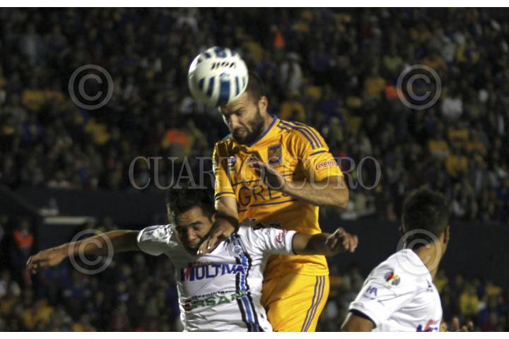 SAN NICOLAS DE LOS GARZA, NUEVO LEÓN, 01NOVIEMBRE2014.- Emanuel Villa del equipo de los Tigres de la UANL se disputa el balón contra Mario Osuna del equipo del Querétaro, en el estadio Universitario, partido correspondiente a la jornada 15 de la Liga MX, Apertura 2014. FOTO: GABRIELA PEREZ MONTIEL / CUARTOSCURO.COM
