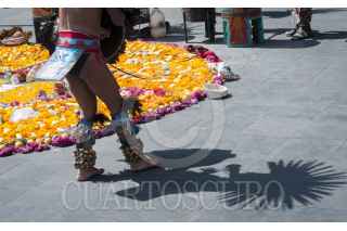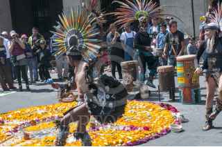 MÉXICO, D.F., 02NOVIEMBRE2014.- Recordando la celebración del día de Muertos en la época de la cultura azteca, un grupo de bailarines coloco una ofrenda frente al monumento de la Fundación México-Tenochtitlán para realizar danzas con música prehispánica. FOTO: DIEGO SIMÓN SÁNCHEZ /CUARTOSCO.COM
