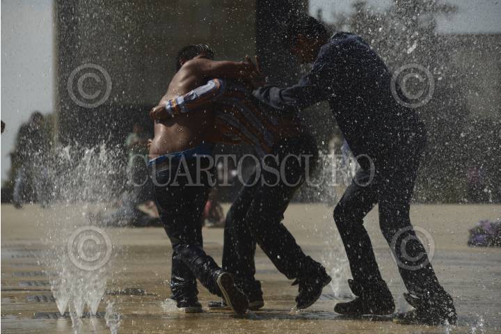 MÉXICO. D.F., 03NOVIEMBRE2014.- Jóvenes refrescándose y jugando a los pies del monumento a la Revolución. Mientras en la ciudad se vive una temperatura de más de 24 ºC, este primer lunes de noviembre. FOTO: ISABEL MATEOS /CUARTOSCURO.COM