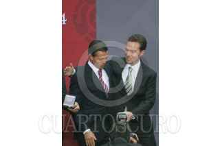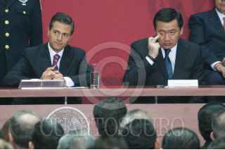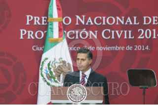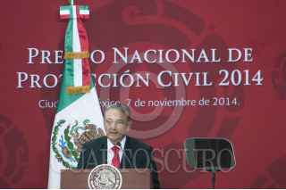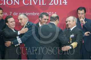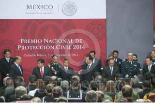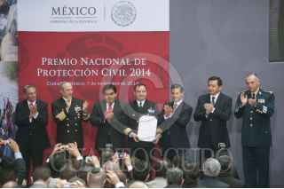 MÉXICO, D.F., 07NOVIEMBRE2014.- César Duarte Jáquez, gobernador de Chihuahua; Miguel Barbosa Huerta, senador del PRD; Enrique Peña Nieto, presidente de México; Miguel Ángel Osorio Chong, secretario de Gobernación; Luis García Moreno, de Protección Civil de Chiapas; Salvador Cienfuegos, secretario de la Defensa Nacional, y Manuel Velasco Coello, gobernador de Chiapas, durante la entrega del Premio Nacional de Protección Civil realizado en el patio de honor del Palacio Nacional. FOTO: DIEGO SIMÓN SÁNCHEZ /CUARTOSCURO.COM