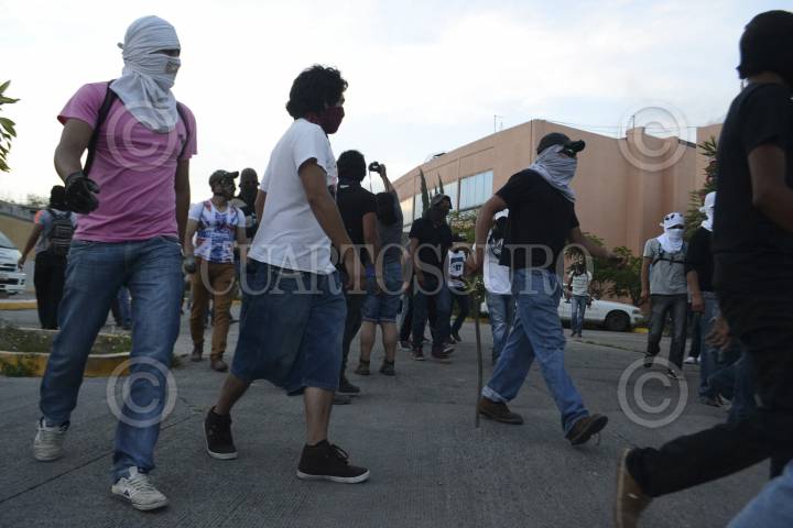 CHILPANCINGO, GUERRERO, 08NOVIEMBRE2014.-15 automóviles dañados unos incendiados y los vidrios rotos del Palacio de Gobierno fue el saldo después de que decenas de encapuchados causaron destrozos en edificios públicos esto en demanda de la presentación con vida de los 43 estudiantes desaparecidos, estudiantes de la normal de Ayotzinapa. FOTO: JOSÉ I. HERNÁNDEZ /CUARTOSCURO.COM