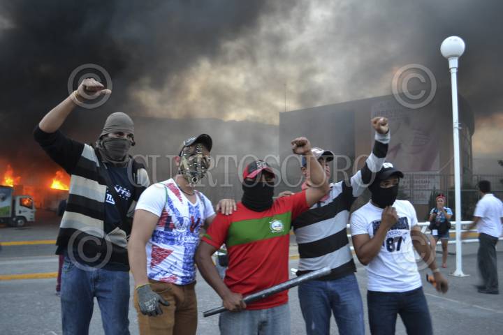 CHILPANCINGO, GUERRERO, 08NOVIEMBRE2014.-15 automóviles dañados unos incendiados y los vidrios rotos del Palacio de Gobierno fue el saldo después de que decenas de encapuchados causaron destrozos en edificios públicos esto en demanda de la presentación con vida de los 43 estudiantes desaparecidos, estudiantes de la normal de Ayotzinapa. FOTO: JOSÉ I. HERNÁNDEZ /CUARTOSCURO.COM