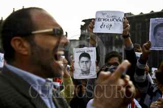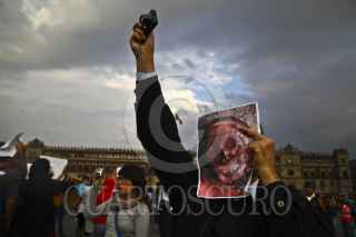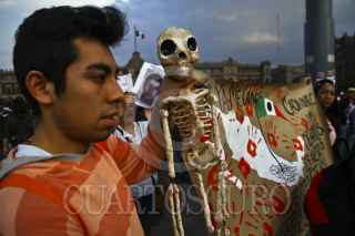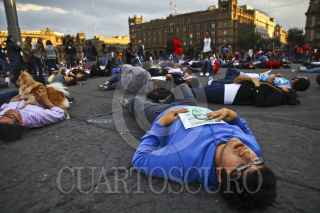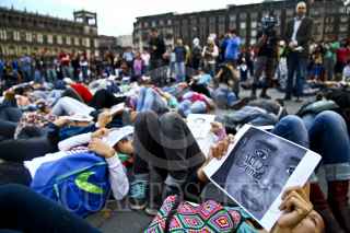 MÉXICO, D.F., 08NOVIEMBRE2014.- Decenas de personas se manifestaron en la plancha del Zócalo en donde realizaron una manifestación que consistió en acostarse y cubrirse la cara con fotografías de los 43 normalistas desaparecidos en Ayotzinapa hace más de cuarenta días en Iguala. Ayer la PGR informó que según sus investigaciones todo parece indicar que fueron asesinados e incinerados, sin embargo, los padres de los estudiantes se han negado aceptar esta versión hasta que no haya pruebas periciales que confirmen su identidad. FOTO: RASHIDE FRIAS /CUARTOSCURO.COM