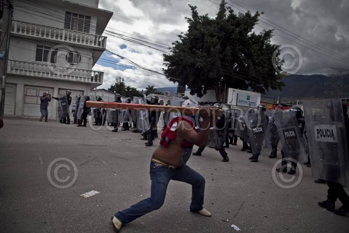 CHILPANCINGO, GUERRERO 11NOVIEMBRE2014.- Integrantes de la CETEG, MPG y normalistas en apoyo a Ayotzinapa, quemaron las instalaciones del PRI en Guerrero y se enfrentaron con elementos de la policía federal, para exigir que se aclaren los hechos con los 43 estudiantes desparecidos en Iguala. FOTO: RASHIDE FRIAS / CUARTOSCURO.COM