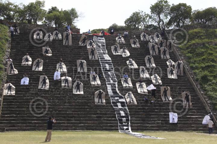 OAXACA, OAXACA, 12NOVIEMBRE2014.- Integrantes la organización, Comuna Oaxaca que encabeza Flavio Sosa Villavicencio, ex líder de la Asamblea Popular de los Pueblos de Oaxaca (APPO) protestaron este medio día en la zona arqueológica de Monte Albán, donde colocaron 43 siluetas en representación de los normalistas desaparecidos en Iguala, Guerrero. Con esto los manifestantes exigieron la presentación con vida de los estudiantes. FOTO: ARTURO PÉREZ ALFONSO /CUARTOSCURO.COM