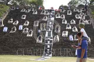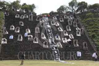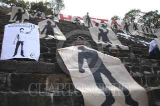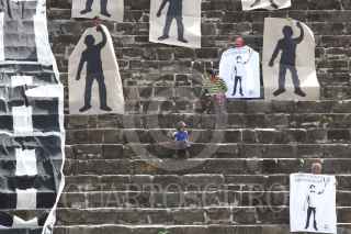 OAXACA, OAXACA, 12NOVIEMBRE2014.- Integrantes la organización, Comuna Oaxaca que encabeza Flavio Sosa Villavicencio, ex líder de la Asamblea Popular de los Pueblos de Oaxaca (APPO) protestaron este medio día en la zona arqueológica de Monte Albán, donde colocaron 43 siluetas en representación de los normalistas desaparecidos en Iguala, Guerrero. Con esto los manifestantes exigieron la presentación con vida de los estudiantes. FOTO: ARTURO PÉREZ ALFONSO /CUARTOSCURO.COM